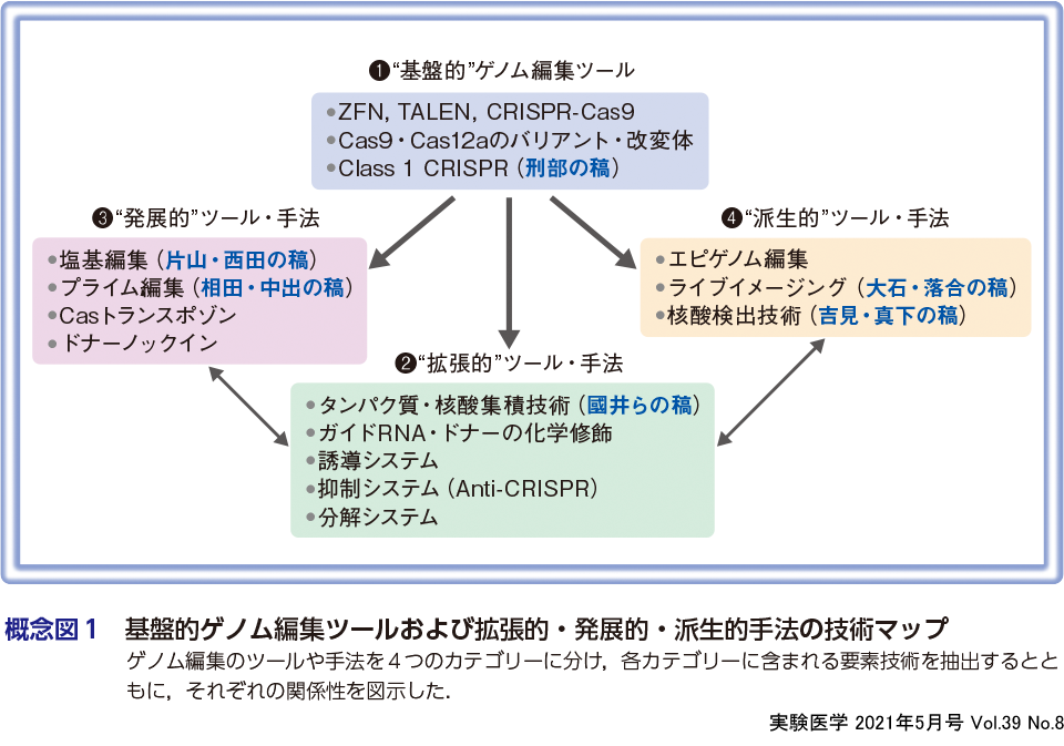 本項目では,DNAの認識と切断を担う,いわゆる❶“基盤的”な「ゲノム編集ツール」を起点とし,そこから分岐する三要素を❷“拡張的”ツール・手法,❸“発展的”ツール・手法,❹“派生的”ツール・手法に分類して紹介する.基盤ツールに改変や改良を加えたプラットフォーム技術を“拡張的”なツール・手法と定義し,あくまでもゲノムDNA配列の改変を目的としつつ,従来のゲノム編集のコンセプトとは異なるメカニズムにもとづく技術を“発展的”なツール・手法,DNA配列の改変以外の目的に転用する技術を“派生的”なツール・手法としてそれぞれカテゴライズする.これらの三要素は,基盤ツールをベースとする開発物であることが共通しており,また改変型・改良型の拡張的プラットフォームは,発展的手法や派生的手法と相互に関連しうる,という関係性が技術マップの全体像となる(概念図1).なお本稿は,最新動向の紹介を目的としたものであるため,いずれのカテゴリーにおいても,「基礎の基礎」にあたる情報は割愛する.初学者にはハードルの高い内容となるので,参考図書にあげた書籍等を利用し,ゲノム編集の基本情報を頭に入れたうえでお読みいただきたい.