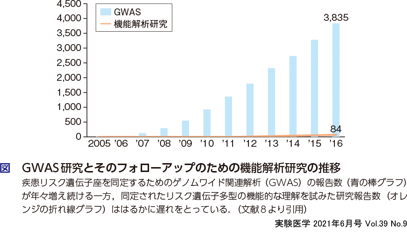 では,近年の遺伝学とビッグデータ解析の進歩は精神疾患の病態生理メカニズムの理解にどのように貢献しているだろうか? まず,当然のことながら,精神疾患のGWASからは神経回路機能異常の原因となる神経伝達物質とその制御に関与する分子の異常が確認されてきた.同時に,多因子性の身体疾患にも共通する多くの器質的な異常を示唆する知見が見出され,これらが,精神疾患にみられる神経回路機能異常とともに疾患病態にかかわるらしいこと,あるいは,神経回路機能異常はむしろエピフェノメノン(付帯現象)であり,その背景にある根本の原因として脳以外の全身にわたる器質異常がかかわるらしいことが示唆されてきている.しかしこれらの興味深いデータはそのままではヒト遺伝学上の相関関係を示すにとどまる.病態生理として確立し診断や治療へ向けた意義づけを行うには,因果関係を証明する機能解析によって支持される必要がある.ヒトゲノムプロジェクトが完了したのち,2005年以降,精神疾患に限らず全体として数千を超えるGWASが行われ,各種疾患に関与する遺伝的背景が明らかにされつつある一方,機能解析により因果関係の証明に至った研究は二桁少ないことが最近の論文で指摘されている(図)8).つまり,多くの報告されている遺伝学的知見は機能解析による検証と意義づけがされないまま,データとして誰かに利用される日を待ち続けている.精神疾患の遺伝学研究もこのなかに若干数含まれるが,これらが今後放置されることなくフォローアップされ病態の解明と診断・治療開発へと応用される必要がある.