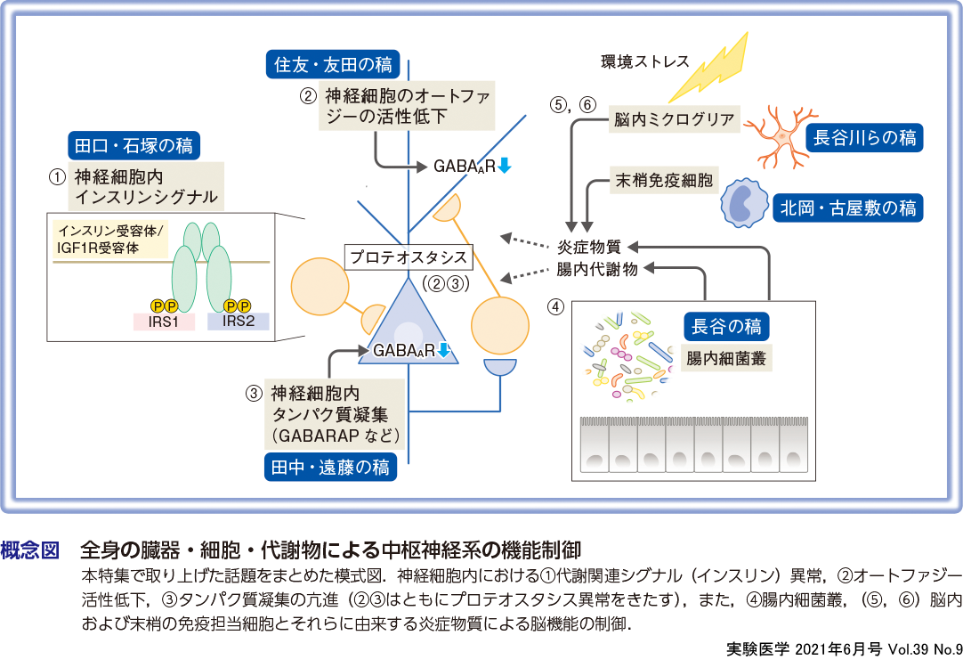 以上,さまざまなアプローチによる精神疾患病態生理の解析の試みの例を簡単に列挙したが,詳細は続く各論でそれぞれの筆者の先生方の稿を読んでみていただきたい.最後に,本特集で取り上げた話題と脳機能制御の関係を概念図にまとめた.領域としては代謝疾患,炎症あるいは免疫異常,微生物学,基礎細胞生物学的変化と多岐にわたるメカニズムが精神疾患の病態生理に関与しているわけだが,統括的なキーワードは,『全身』の病態に着目することであり,精神疾患を,外因性・内因性のサイコジェニックな(心因性の)ストレスに対する神経系の『ストレス応答反応』と定義することに尽きると思う.このアプローチが今後さらに関連領域を巻き込んで学際的な研究分野として発展し,新たな診断・治療戦略の構築につながることを期待したい.