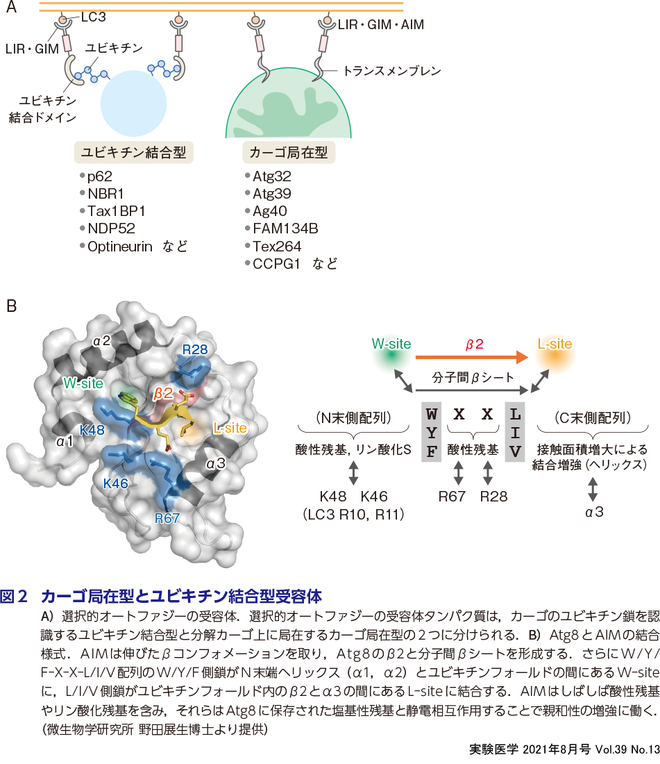 これまでオートファゴソームがカーゴを特異的に取り囲む決定的な要因は,受容体とAtg8ファミリータンパク質との結合と考えられてきた12).しかし,酵母の選択的オートファジーの場合,受容体はAtg8のみならずAtg11(高等動物のFIP200に相当)とも結合する(中戸川の稿).このAtg11の機能によりカーゴに限局したAtgタンパク質の繋留,オートファゴソーム形成が可能となると考えられる.一方,代表的なユビキチン結合型受容体であるp62,NBR1,Tax1BP1,NDP52,Optineurin(コアユビキチン結合型受容体)はULK1タンパク質リン酸化酵素複合体のコンポーネントであるFIP200 13)〜16)と,OptineurinはATG9とも結合する17)(松田の稿,千野・水島の稿).ER-phagyのカーゴ局在型受容体CCPG1やTEX264もFIP200と結合する.さらに,FIP200と結合するユビキチン結合型受容体同士(p62とNBR1やTax1BP1とNBR1)の結合18)〜20)やTax1BP1,NDP52,Optineurin間でULK1タンパク質リン酸化酵素複合体のリクルート能力の差があることもわかってきた21).カーゴ上で受容体が相補的に働き上流因子をリクルートし,隔離膜形成を促すことが想定される.ただし,そのような相互補完的に機能する受容体でも,Parkin-PINK1依存的なマイトファジーのように複数の受容体が働く場合に,コアとなる受容体(NDP52,Optineurin)が存在する場合もある22).驚いたことに,Atg11とは異なり,FIP200は受容体のLIR(後述)を介してLC3と相互排他的に結合するようである23).受容体はリン酸化・脱リン酸化により結合が制御される.特に,出芽酵母で同定されている受容体のリン酸化はAtg11との結合を高める(中戸川の稿).