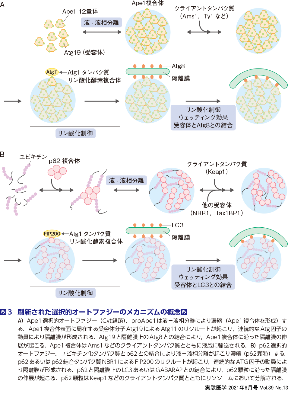 酵母の液胞酵素Ape1の前駆体proApe1は液−液相分離により液滴(Ape1複合体)となりcytoplasmic-to-vacuole targeting(Cvt)小胞(オートファゴソームに相当)により取り囲まれ,液胞に輸送される(図3).Ape1複合体には,それ自身に液滴形成能がないタンパク質群(クライアント)が含まれ,Ape1複合体とともに液胞に運ばれる.これらクライアントの液胞への輸送は,不要酵素の分解といった生理作用をもつ(中戸川の稿).高等生物の場合には,受容体分子を介した多様なシグナル伝達分子の分解機構が存在することから,さらに複雑である(山本の稿).例えば,p62顆粒は,ストレス下のユビキチン化タンパク質の増加に応じて形成される液滴であると考えられるが,この液滴に含まれるクライアントKeap1は転写因子Nrf2のユビキチンリガーゼであり,p62液滴に取り込まれ,オートファジーにより分解されると,Nrf2が活性化,抗酸化タンパク質の遺伝子発現が誘導される31).また,細胞内侵入ネズミチフス菌がK63鎖のユビキチンを付加されると,ユビキチンのN末端メチオニンを介する直鎖状ポリユビキチン鎖を生成するユビキチンリガーゼ複合体LUBACがリクルートされる.LUBACによる直鎖状ユビキチン鎖の形成は,受容体であるOptineurinとNEMOの転移を促し,それぞれオートファジーによるネズミチフス菌除去(ゼノファジー)とNF-κB活性化を惹起,ともに細菌の増殖を抑制する30)32).このような選択的オートファジーと共役した生体防御機構はリソファジーにも存在する.損傷リソソームに対応して,ESCRT複合体による膜修復,リソファジーによる隔離・分解,転写因子TFEB活性化によるリソソーム生合成の誘導が順次起こる.これら複雑な機構を紡ぐ機構が見えてきた(中村らの稿).