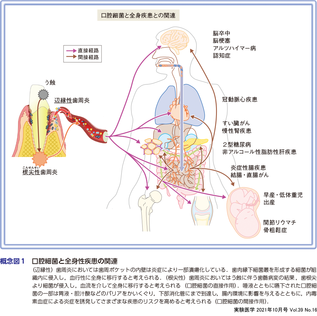 興味深いことに結腸直腸がん,関節リウマチ,肝硬変,炎症性腸疾患の患者腸内細菌叢に占める口腔細菌の比率が上昇しているとの報告が相次いでおり,口腔細菌の腸内細菌への影響とそれを介した病因への関与が注目されるようになってきた(山崎恭子・山崎和久の稿)(概念図1).
