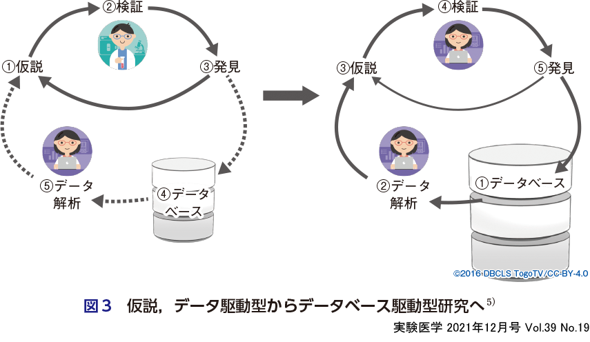 2021年現在,多くの生命科学研究者はCOVID-19の影響で当初の計画通りに実験ができず,「データ」を出すことができない状況にある.そこで,自ら実験して「データ」を出すのではなく,公共のデータベース(以下DB)に蓄えられたデータを検索し,そのなかから自らの研究に関係のあるデータを集めてきてデータ解析するという「データ利活用」による研究推進の流れが注目されている(林のコラム,図3).このデータ駆動型の研究スタイルもバイオDXとして捉えることができると筆者は考えている.