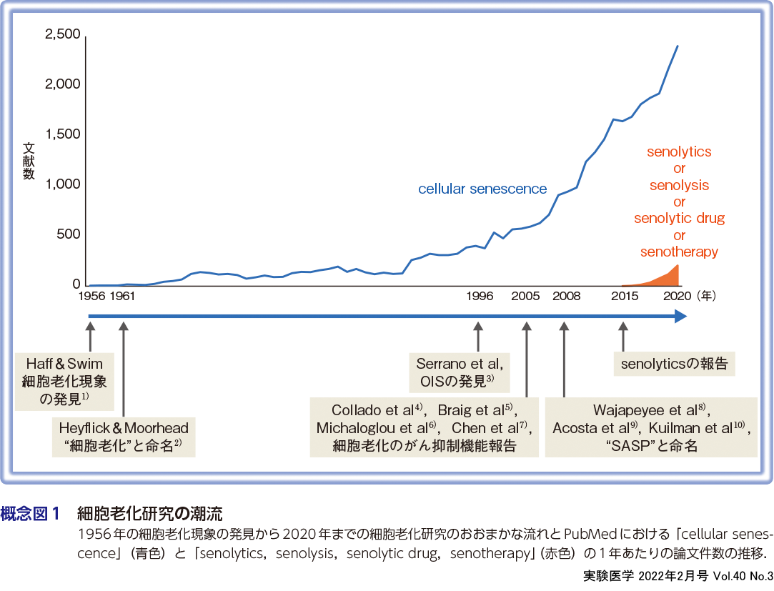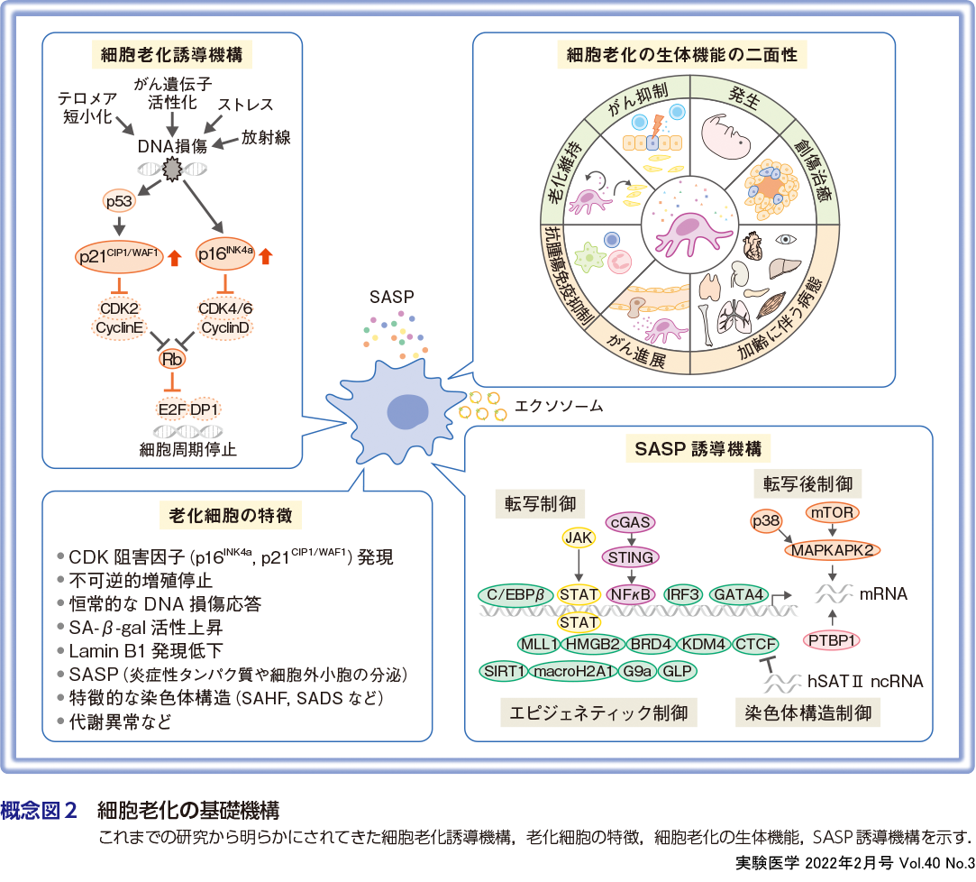 細胞老化現象の発見は1956年に遡り,哺乳動物の正常な組織からとり出した体細胞をin vitroで培養した際に,分裂をくり返した細胞がそれ以上増殖できない現象として報告された1).これは,培養細胞が分裂の限界(Heyflick limit)を迎えた増殖停止状態であり,今では複製老化(replicative senescence)として理解されている2).1996年にSerrano博士らが,変異型Rasの発現によっても複製老化と同様の増殖停止状態が誘導されるという,がん遺伝子誘導性の細胞老化(oncogene-induced senescence,OIS)を報告し3),2005年には,細胞老化が生体内の前がん病変部や良性腫瘍部で重要ながん抑制機構として機能することが報告された4)〜7).2008年には,老化細胞が炎症性サイトカイン,ケモカイン,増殖因子や細胞外マトリクス分解酵素などのタンパク質群を分泌する細胞老化随伴分泌現象が,senescence-associated secretory phenotype(SASP)もしくはsenescence-messaging secretome(SMS)と名付けられ,細胞老化は1細胞内で自己完結する現象ではなく,生体ネットワークのなかで多彩な機能を有する可能性が示唆された8)〜10).そして,老化細胞に細胞死を誘導し治療標的とするsenolysis(seno=老化,lysis=溶解)という概念に基づいた“senolytics”が提唱された2015年以降,あらゆる加齢性の病態がその研究対象となることから,近年,研究領域が爆発的に拡大し注目を集めている(概念図1).