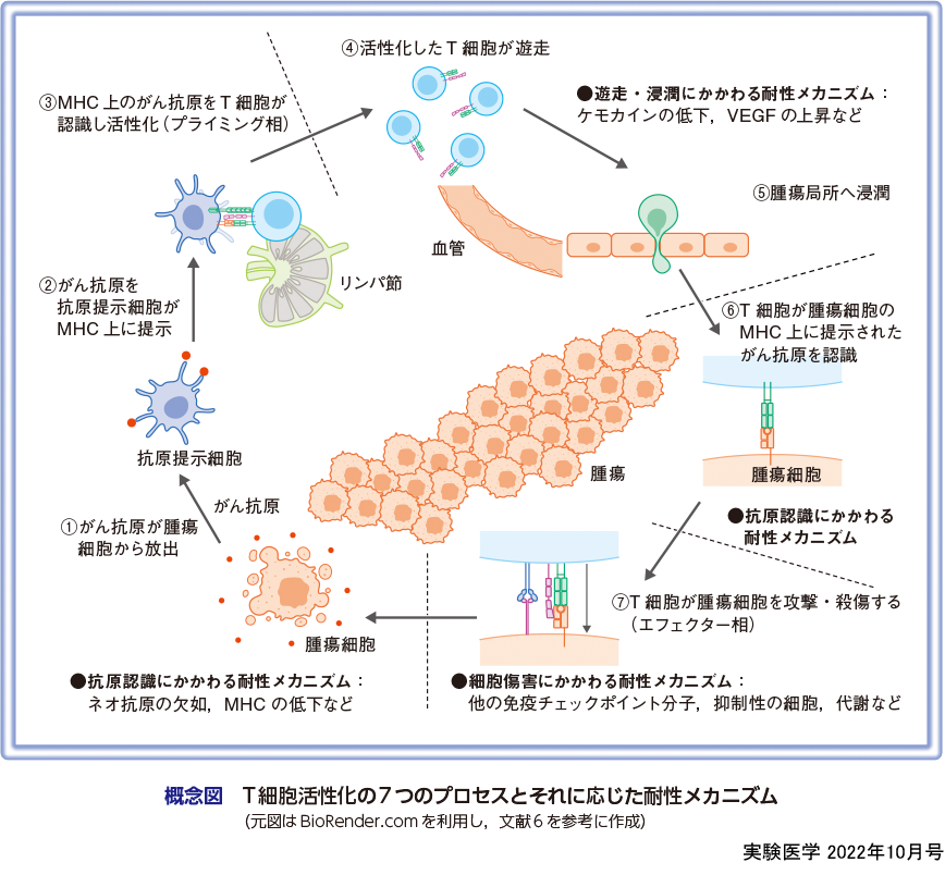 EGFR遺伝子変異肺がんに対するEGFR-TKIの耐性はそのメカニズムの頻度が異なるため,初期耐性と獲得耐性で分けて論じている場合が多い.一方で,免疫チェックポイント阻害薬では頻度に大きな差があるかは不明な点も多く,どのメカニズムも初期耐性・獲得耐性の両方を起こしうるため,本稿ではこれらをまとめて議論する.IFN(interferon)-γ,VEGF(vascular endothelial growth factor),TGF(transforming growth factor)-βなどのように多彩な作用をもつ因子も耐性機序として報告されており,必ずしも1つの原因に対して1つのメカニズムとは分類しきれないところもある.一見すると議論が非常に複雑に見えてしまうが,最終的に辿り着くところはやはりT細胞活性化プロセスであり,ほとんどの耐性メカニズムも何らかの形でここにかかわってくるため,本稿ではT細胞活性化プロセスに沿って論じたい6).