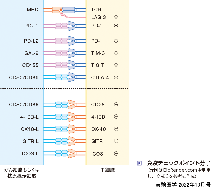 それ以外にも免疫チェックポイント分子はたくさん存在し,CTLA-4 やPD-1同様に抑制性のものもあれば,逆にT細胞を活性化するような分子もあり,それぞれ異なったメカニズムで抑制や活性化に働いている(図)9).