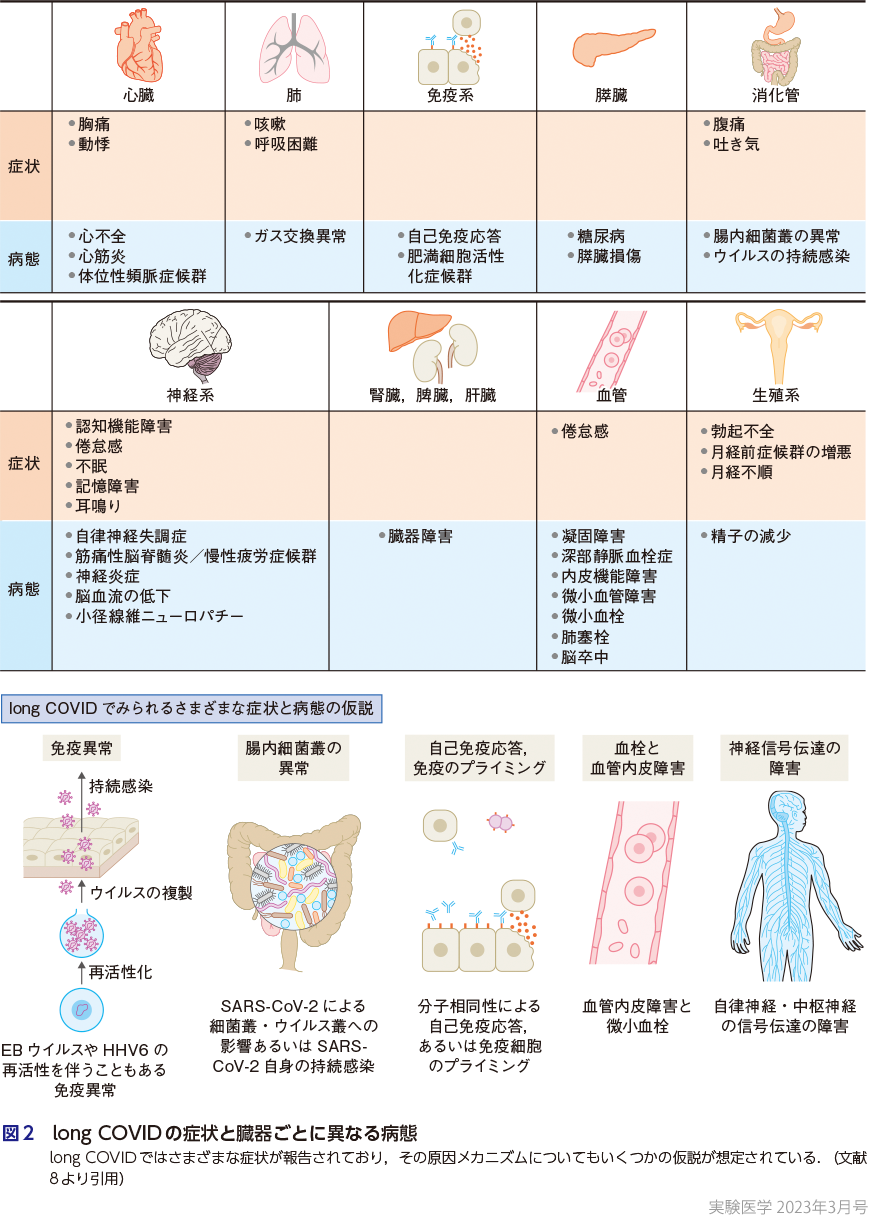 COVID-19に罹患した後に,一部の患者でlong COVIDあるいはpost-acute sequelae of COVID-19,post COVID-19 condition 等と言われる後遺症が生じることが報告されている.long COVIDの明確な定義はないが,その多くは急性期症状や経過中に新たに生じた症状などが長期にわたり持続し,ほかの疾患で説明できない状態をさし,疲労感・倦怠感,関節痛,筋肉痛などの症状が報告されている(図2)8)9).long COVIDには重症化のメカニズムと同様に,自然免疫,獲得免疫のいずれの免疫応答がかかわっていると考えられているが,それ以外にも神経の信号伝達異常などのさまざまな機序が想定されている.さらに,男女差やウイルス側の因子もあり,特に,重症化とは対照的に女性の方がリスクが高いと報告されており,そのメカニズムの解明が注目される(上野氏の稿).