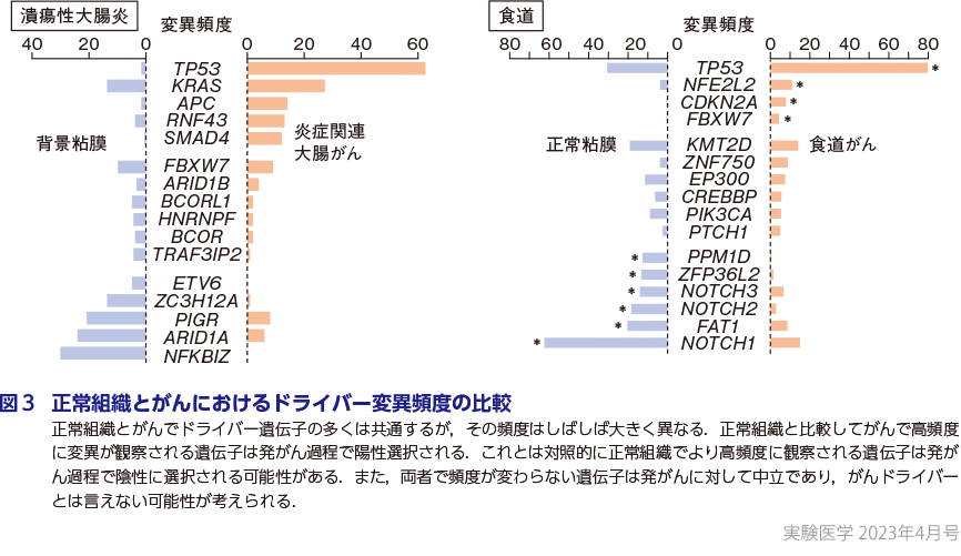 正常組織で選択されるドライバー遺伝子の多くは対応する臓器のがんドライバー遺伝子と共通することから,正常組織における変異クローンはがんの起源と考えられている.従来から最初のがんドライバー変異が獲得される時期はがんと診断される数十年前に遡ると考えられてきたが19),食道の観察では,時に乳幼児期といった人生の早期にがんドライバー変異が獲得されることが明らかとなった(横山の稿)20).このことは,ドライバー変異そのものは環境因子に長期間暴露される前から組織中に生じうることを意味する.長期間にわたって環境因子と変異クローンとの相互作用によってクローン拡大し,そのなかから追加のドライバー変異を獲得したサブクローンが現れ,最終的にがんに至ると考えられる.正常組織とがんで観察されるドライバー変異の頻度を比較すると,正常組織の方が変異頻度が高い遺伝子変異(例えば潰瘍性大腸炎におけるNFKBIZ変異など)が存在し,このようなクローンそのものはがんへと進化し難い(=発がんのコンテキストでは陰性に選択される)ことが明らかとなり11),正常組織におけるクローン進化はがんのみに帰結しないことを示唆している(図3).また,正常組織とがんとの間で変異頻度が同程度の遺伝子は,従来のがんのゲノム解析ではがんドライバーと考えられて来たが,正常組織において選択を受けた遺伝子ががんに受け継がれた結果を見ているとも考えられ,発がんを積極的に促進しているわけではない可能性が考えられる3)(図3).NFKBIZ変異に代表される炎症関連遺伝子に変異によって再構築された大腸上皮は炎症性刺激への応答が変化しており11)15),このことは,加齢や環境因子に暴露された結果,変異クローンによって再構築された臓器は機能的に元の臓器とは異なると考えられ,加齢による臓器機能の低下や疾患の病態を修飾する因子となっている可能性がある.また,正常組織におけるクローン拡大が他臓器の疾患を惹起する例としてクローン性造血が動脈硬化・心血管イベントの原因となっていることが明らかになっており8)21)22),他臓器・疾患への関与についても今後のさらなる研究が期待される.