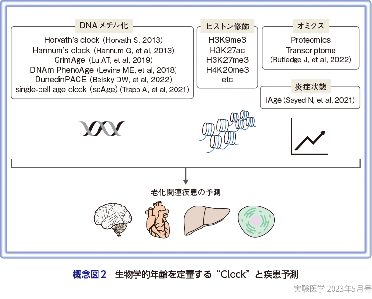 DNAやヒストン修飾と並行して,血液中の炎症性因子,ケモカインであるCXCL9が加齢とともに増加し,心臓疾患や,悪性脳腫瘍と相関があることも報告されており,炎症性時計(inflammatory aging clock,iAge)とよばれる10).現在では,年齢や疾患によって変化するバイオマーカーについて,タンパク質,代謝産物,転写パターンなどさまざまなAging Clock開発の試みが進められている(Omics Clock)11)(概念図2).