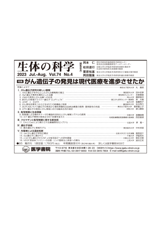 がんにおけるRNAスプライシング異常の研究は,最近10年ほどで活発になってきた,がん研究のなかでも比較的新しい分野である.本特集では,スプライシング異常ががんの病態形成にどのようにかかわり,またスプライシング異常をどのように治療標的として狙い得るのか,という点に焦点を絞り,基礎研究から臨床試験まで,研究・開発に取り組み活躍されている研究者に,最近の知見の概説と新しい研究成果について寄稿をご依頼した.この研究分野に関する研究の潮流や最近の動向について,大まかに把握していただけると幸いである.…