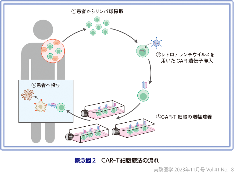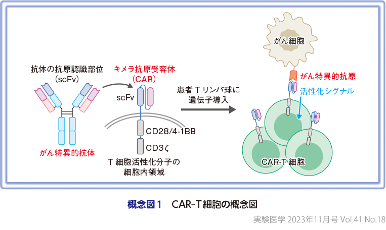 がんを免疫系に異物として認識・排除させる方法として,モノクローナル抗体がすでに広く臨床応用されている.そこで,モノクローナル抗体の抗原認識部位を利用し,Tリンパ球にがん細胞を異物として上手く認識させようというのがキメラ抗原受容体(chimeric antigen receptor,CAR)のアイデアである.抗体の抗原認識部位とT細胞を活性化する分子(CD28あるいは41BBと,CD3ζ)を融合させてCARを構築する.レトロウイルスベクター等により,CARをT細胞に遺伝子導入したものがCAR-T細胞である(概念図1).患者から採取した末梢血リンパ球にCAR遺伝子を導入し,増幅培養した後,体内へ戻すことで治療が行われる(概念図2).CAR-T細胞は,抗体と細胞傷害性T細胞の長所を併せもった細胞で,抗体のように高い特異性でがん特異的抗原を認識し,細胞傷害性T細胞のように強い細胞傷害活性と高い増殖力をもってがんを攻撃する.