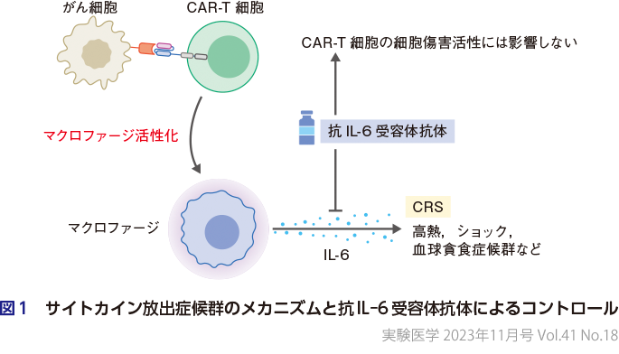 当初はサイトカイン放出症候群(cytokine release syndrome,CRS)が重篤な有害事象として問題となっていた.CRSはいわばCAR-T細胞の “効きすぎ” により起こる高サイトカイン血症である.しかし,抗IL-6受容体抗体がCRSに著効することが明らかになった.しかも,CAR- T細胞活性化に引き続いて起こる活性化マクロファージからのIL-6の過剰分泌がCRSの中心的な病態であることが明らかになり5),IL-6受容体を抗IL-6受容体抗体により抑制しても抗腫瘍効果には影響しないと考えられる(図1)ので,より早期から抗IL-6受容体抗体を用いてCRSをコントロールすることにより,CAR-T細胞療法は比較的安全に施行可能となっている.