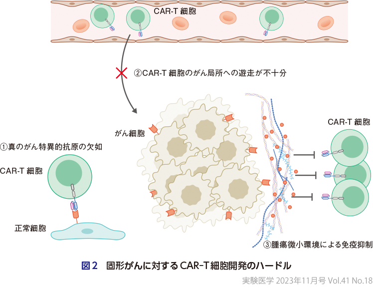 当然のことながら固形がんに対してもCAR-T細胞が開発できないかと考えられ,世界中でさまざまなものが開発されている.特に,遺伝子変異の数(tumor mutation burden)が少なく,免疫原性が低いと考えられるがん種においては,ネオアンチゲン(がん細胞特異的な遺伝子変異に由来する抗原)に対する抗原特異的がん免疫反応が生理的に起こりにくいので,単一(あるいは少数)の抗原を標的とするCAR-T細胞療法は魅力的な免疫療法である.最近になり,脳腫瘍や神経芽腫に対するGD2 CAR-T細胞や,胃がんに対するClaudin18.2 CAR-T細胞等,臨床効果が報告されるものも出つつあり,光明はみられる.しかしながら,全体的には,まだまだ血液がんに対するものと比べるとその効果は不十分である.固形がんに対するCAR-T細胞の開発に難渋している理由は,前に述べたがん特異的標的抗原の欠如の他に,大きく2つがあげられる(図2).