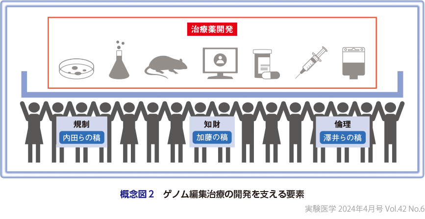 さらに,PartⅡ「社会実装にむけた課題とその解決法」(概念図2)として,内田先生らの稿では,内田恵理子先生,山下拓真先生,山本武範先生,井上貴雄先生に,ゲノム編集治療に関する国内の規制整備の現状について解説していただいた.「治験」と「臨床研究」の2つの臨床試験を実施するうえでの規制の違いや,「in vivo」と「ex vivo」ゲノム編集治療の規制の違いをわかりやすくまとめていただいている.さらに,ゲノム編集治療で求められる品質・安全性評価についても言及いただいた.加藤先生の稿では,ゲノム編集技術の知財戦略について概説していただいた.基本特許と改良特許,さらに世界と国内のゲノム編集技術に関する知財の現状を紹介いただき,今後の知財戦略の方向性にも言及いただいた.澤井先生らの稿では,澤井努先生,片岡雅知先生,金子未穂先生に,ゲノム編集技術の倫理やガバナンスについて解説いただいた.2023年に3回目の開催を迎えたヒトゲノム編集国際サミットの様子を紹介いただきつつ,研究・医療目的でのヒトゲノム編集に伴う倫理的課題,市民参画の動向と展望,今後の倫理・ガバナンスにおける方向性について言及いただいた.