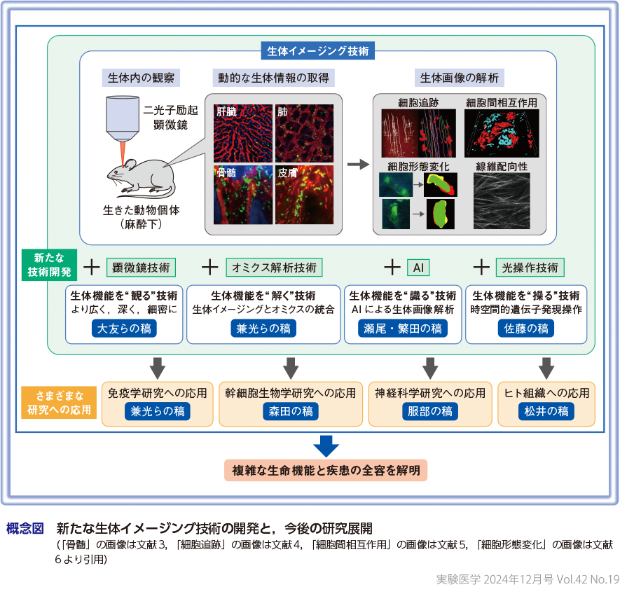 生体イメージング技術の発展により,生きた動物の組織内で多種多様な細胞がそれぞれどのような動態を示し,どの細胞間で直接的な相互作用をし,その結果として細胞の機能・状態がどのように変化するのか,といった連続的なプロセスが明らかになってきた.また,オミクス解析技術が驚異的な発展を遂げたことにより,複雑な生命現象にかかわる細胞種の全容や分子メカニズムが明らかとなりつつある.今後,生体イメージングとオミクス解析技術・AIをうまく組み合わせて解析することで,病態特異的な病原性細胞が生体組織内で実際にどのように活動しているのか,その詳細を1細胞レベルで時空間的に明らかにすることができれば,疾患の本質を正しく理解し,有効な治療法の開発につながると期待される.