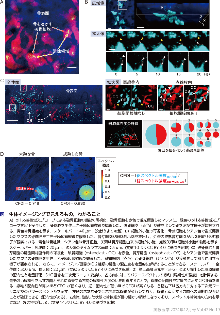 生体イメージングで主流の蛍光観察では,注目する細胞や分子を蛍光分子で標識することにより可視化するが,細胞の自家蛍光や線維から発せられる特殊な光(第二高調波発生,second harmonic generation:SHG)を用いることで,染色せずに観察できる技術の開発が進んでいる.さらに,近年,生体内情報を可視化するためのさまざまなツールが開発され,マウス生体内の細胞内外の物理化学的パラメーター(pHや温度,酸素濃度など)を計測できるようになってきている.われわれも,二光子励起顕微鏡をはじめとした最新の光学観察技術を駆使して,動物個体が生きた状態で,骨髄,肝臓,肺,皮膚などさまざまな生体組織内を観察し,生体内の細胞の動きや機能,細胞同士の相互作用をリアルタイムで解析してきた.例えば,“骨を壊す” 破骨細胞の機能をin vivoで可視化するために,破骨細胞が出す酸を感知して蛍光がonとなるpH応答性蛍光プローブを開発した7)8).その結果,破骨細胞が今まさに骨を溶かしている様子を捉えることに成功し,破骨細胞には機能的に異なる2種類の状態(骨吸収期と休止期)が存在し,両者を遷移することがわかった(図A)6).