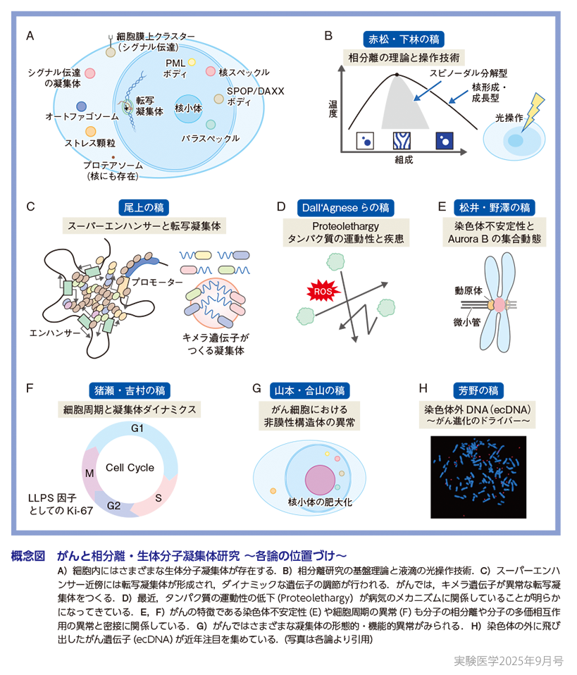 われわれの体を構成する細胞のなかには,「膜をもたない」「多くの分子が集まった」構造体が多く存在し,このような構造体の形成原理として液-液相分離(liquid-liquid phase separation:LLPS)が注目されてきた.相分離の関与が考えられる多彩な非膜性構造体は生体分子凝集体(biomolecular condensate)と総称され,シグナル伝達,遺伝子制御,オートファジーなどの多様な生理機能に関与している1).実験医学では,2019年6月号「細胞内の相分離」,2021年増刊号「相分離 メカニズムと疾患」,2024年8月号「ストレス応答と相分離」で特集が組まれてきた.近年,がんで,相分離・生体分子凝集体の多様な異常がみられることがわかってきた2)〜4).本特集は,「新しい分子生物学・生化学・生物物理学」の分野として成長してきた相分離研究の最前線を概観するとともに,相分離という視点からがん研究の難問に挑むさまざまな研究を紹介し新たな研究の潮流を探る(概念図).
