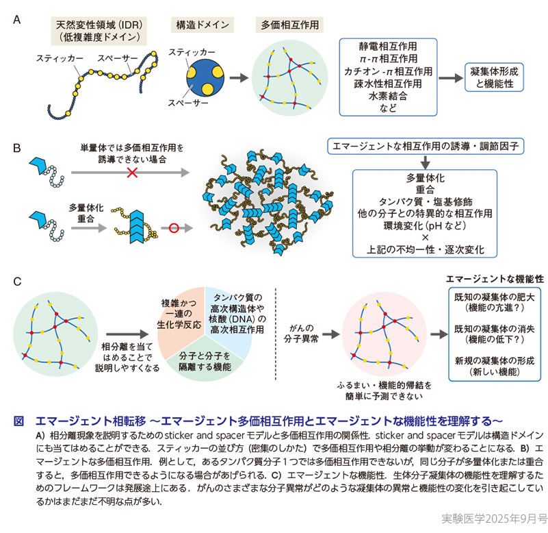 本稿の後半では,「エマージェント相転移」という新しい造語を用いて,相分離・凝集体研究の今後の方向性,そして,がん研究とのクロストークを議論する.「エマージェント(emergent)」は,物理学や相分離・凝集体研究でしばしば使われる形容詞である(日本語としては「創発的」が当てはまる).定義としては,要素が集まったときに,個々の要素のふるまいでは説明できないような,新しい・思いがけないふるまいを呈する様を指す.「エマージェント相転移」とは,「凝集体形成を調節するエマージェントな多価相互作用」がいかに既知の凝集体を変化させ・新たな凝集体をつくり,そして,「エマージェントな機能性」を発揮するか,という話題である(特にがんにおいて)(図).