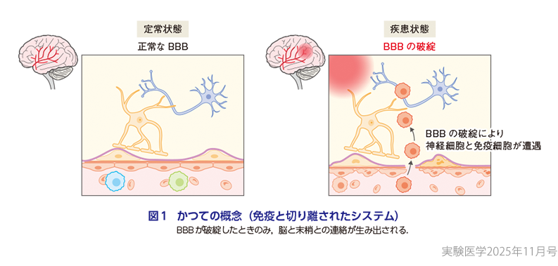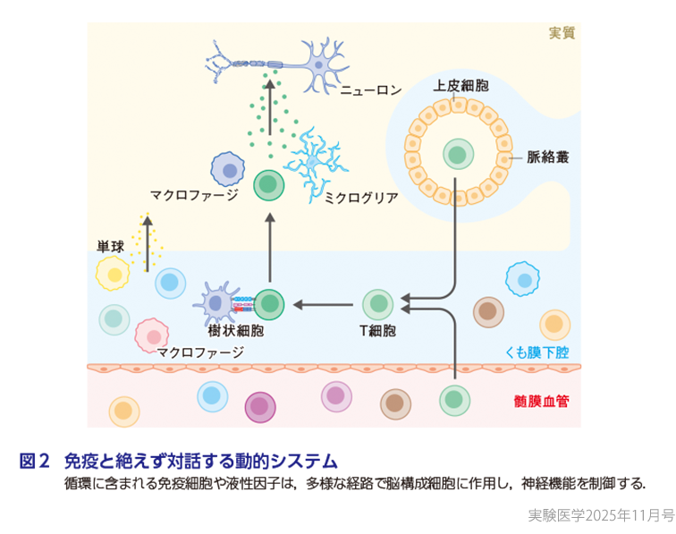 中枢神経系は長らく「免疫特権的」臓器と考えられ,末梢免疫系から隔絶された環境にあると理解されてきた.この概念が提唱された背景には,脳は他臓器に比しリンパ系が乏しいことや,一部の領域を除き脳内には血液脳関門(blood brain barrier:BBB)が備わり,免疫細胞や循環中の液性因子の流入が妨げられることがあげられる.しかし,例えば脳組織の移植において,拒絶反応が惹起されたという事案が20世紀後半に複数報告された.また,BBBの強固なバリアを維持するしくみについては,引き続き新規分子の関与やバリア機能を担う形態学的な発見がある一方で,正常脳でも多様な経路で末梢由来の細胞や液性因子が脳内に流入することも示されてきた.そして近年では,髄膜や脈絡叢に免疫細胞が常在し,さらに脳から末梢に老廃物や液性因子を排出するリンパ管様構造が存在することが明らかとなっている.もちろん,多くの疾患時には脳血管のバリア機能の破綻が検出され,旺盛な細胞・分子の流入が脳内で検出されている.このようなことから,脳はもはや「免疫から切り離された臓器」ではなく,「免疫と絶えず対話する動的システム」として理解されるようになりつつあり,こうした認識の変化により神経免疫学という学際的領域の発展が促され,神経機能制御機構と病態機序が新たな視点で次々と明らかにされている(図1).