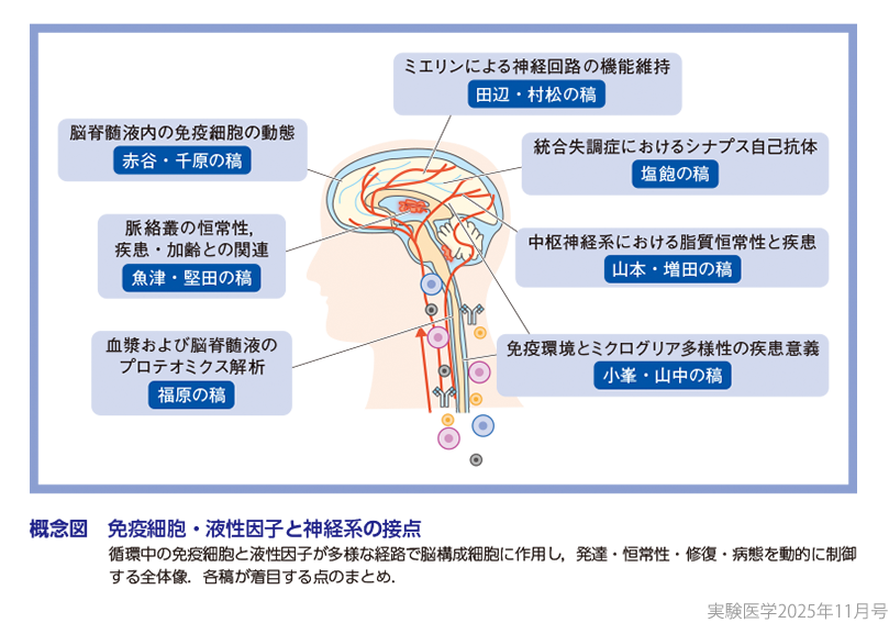 本特集では,中枢神経系が「免疫特権的臓器」とみなされてきた従来の概念から脱却し,免疫細胞や液性因子が神経発達,恒常性維持,損傷修復に多面的に関与する最近の知見を紹介する.近年のシングルセル解析や空間トランスクリプトミクス,リピドミクスなどの技術革新により,免疫や液性因子による神経機能制御機構が可視化され,疾患病態の新たな理解が進んでいる.各論では,液性因子の変動解析,自己抗体による精神疾患病態,脂質代謝異常と神経変性,脳脊髄液免疫細胞動態,ミクログリアの多様性,脈絡叢やミエリン研究の進展を取り上げ,神経免疫学の臨床応用への可能性を示す.