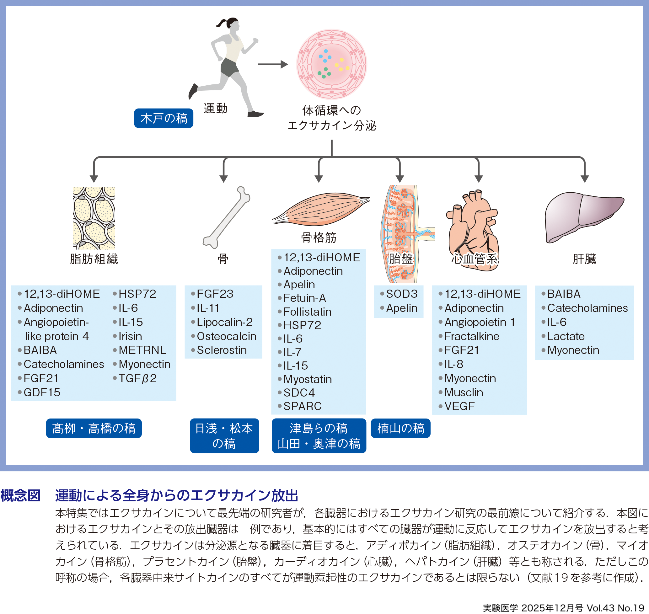骨格筋は体重の約3分の1を占めているのに加え,運動における骨格筋の重要な役割は言うまでもなく,当初はエクサカイン≒骨格筋由来サイトカイン(マイオカイン)という考え方が続いていた.しかしその後,全身における包括的なエクサカイン研究が進展し,心臓(カーディオカイン),肝臓(ヘパトカイン),白色脂肪組織(アディポカイン),褐色脂肪組織(バットカイン),骨組織(オステオカイン),神経系(ニューロカイン),胎盤(プラセントカイン)といった,全身の臓器由来の運動惹起性体液性因子としての定義が根付いてきている.エクサカインは運動を発端とする遠隔臓器ネットワークを制御するだけでなく,自己分泌的効果(分泌した細胞自身への作用)や傍分泌的効果(隣接する細胞への作用)を示すことも報告されている.