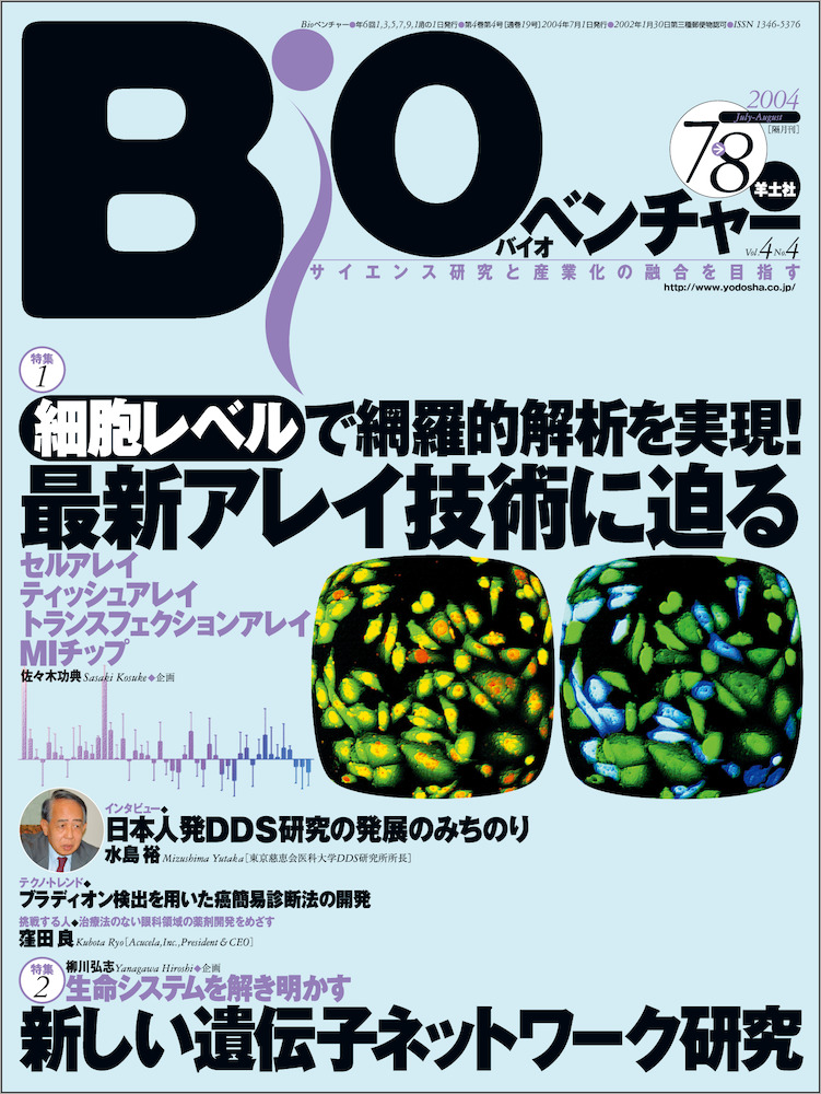 - 【本書名】Bioベンチャー:第1特集:細胞レベルで網羅的解析を実現!最新アレイ技術に迫る 第2特集:生命システムを解き明かす遺伝子ネットワーク研究
