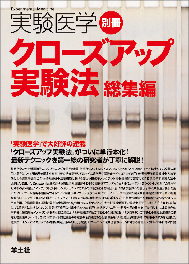 「実験医学」で大好評の連載「クローズアップ実験法」がついに単行本化しました.つねに役立つ最新テクニックを第一線の研究者によって紹介してきた本連載.その1999年から2001年掲載分までに一部加筆修正を加え,さらに新原稿を加えて便利な一冊にまとめました.遺伝子クローニングからタンパク質機能解析,培養法など幅広く網羅しており,まだ実験を覚えたてで,遺伝子クローニングからはじめたいという方から,バリバリの研究者で,先端のゲノムテクノロジーを活用して研究をもっと加速させたいと考えている方まで,本書をお役立ていただければ幸いです.
