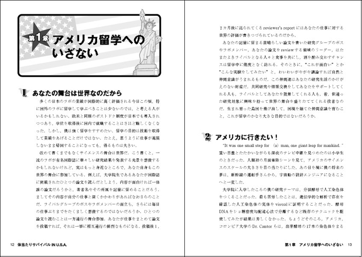 アメリカで12年間を過ごした著者が,留学のきっかけからアメリカ上陸,研究生活やラボ独立,日本への帰国までのサバイバル体験談を絶妙な語り口で紹介します.生きた英語が学べる「体当たり英会話」を収録し,強い味方になる1冊です!