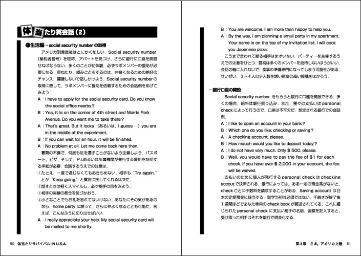 2)What can you do for me?3)ラブレターを書こう4)資金調達5)持っていくもの,要らないもの6)日本でやっておかなければならない手続き第3章 さあ,アメリカ上陸1)アメリカ生活にとけこもう ★Social security numberの取得