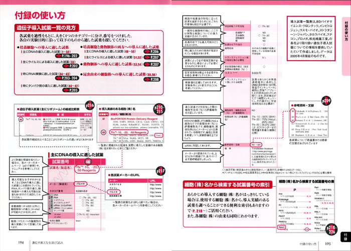 遺伝子導入なしでは研究が進まない…でもいつも失敗してしまう! うまくいかない理由がわからない!など,どんどん遺伝子導入のふかみにはまっていく方は必読!遺伝子の細胞への入り方や導入・発現効率を上げる方法など知っておきたい基礎知識に加え,実は細胞のコンディションが結果を左右していた!など実験の失敗を回避する操作上のコツやトラブルへの対処法が満載.また,動物個体への遺伝子導入も解説されています.そして一番の特長が巻末付録の『遺伝子導入試薬の性能別比較一覧』です.たくさんある導入試薬の中から自分にぴったりのものが一目で選べる一覧表や自分が使用する細胞(株)名から導入実績のある試薬がわかる索引があり,初心者からベテランまでみんなに役立つ1冊です.