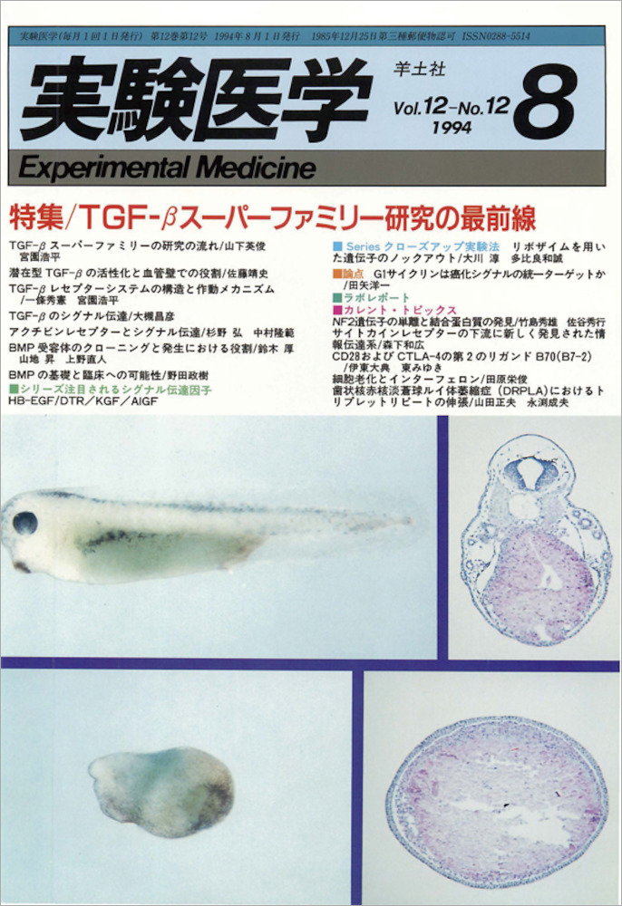 今月は,ファミリー形成の発見から大きな盛り上がりをみせ続けるTGF-βスーパーファミリーの研究の発達について,宮園浩平先生,山下英俊先生に企画をお願いいたしました.盛んな研究の先にはまだまだ思いもしない結果が待ち受けていることでしょう.それが見えたときが研究者の方々の至福のときなのだと思います.