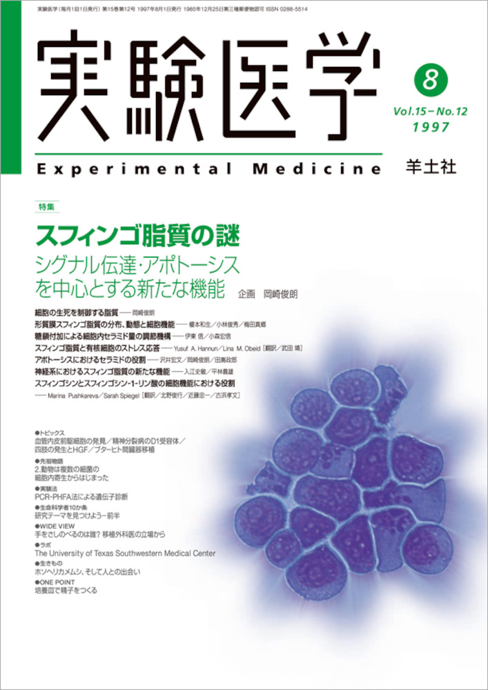 生体膜の構成成分スフィンゴ脂質といえば,生化学の教科書にも載っている知名度の高い物質です.それが最近になってその機能解析が進み,増殖・分化,はてはアポトーシスにまで関与する,重要な細胞内シグナル伝達物質として働くことが判明してきました.出芽酵母の全ゲノム塩基配列が解読されるなど,遺伝子レベルの研究が急速に進むなか,これからのスフインゴ脂質の謎解きを多いに期待したいところです.また本号では,大野乾先生,柳田充弘先生の強力連載のほか,6月に可決された臓器移植法案に一石を投じる記事など,盛りだくさんの内容となっております.