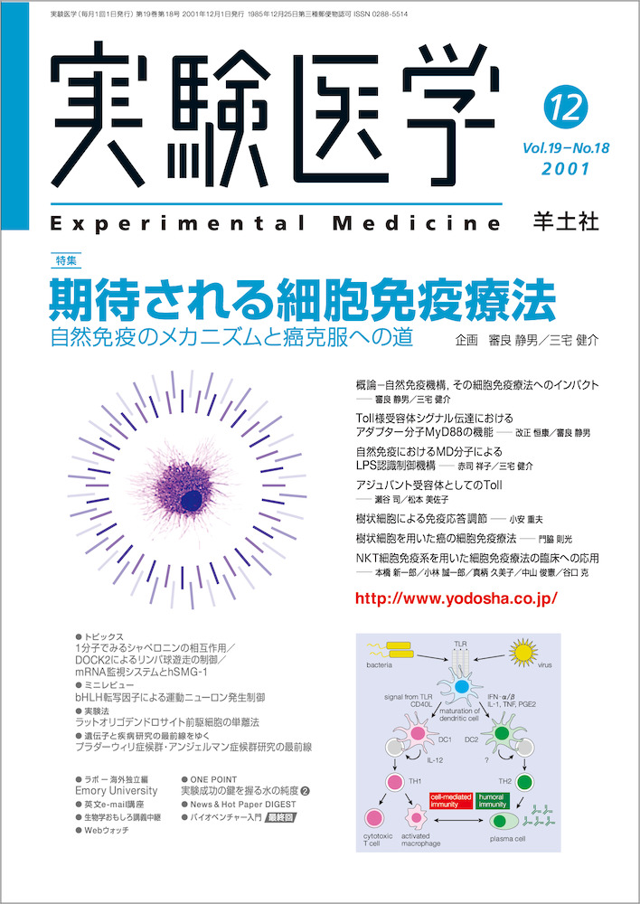 近年,癌に対する有効な治療法として細胞免疫療法が期待を集めています.この背景には,自然免疫系において異物を認識するToll様受容体ファミリーの存在,そして自然免疫系を担う樹状細胞が獲得免疫を活性化させる強力な抗原提示細胞であるという発見があります.そこで本号では,自然免疫系におけるToll様受容体ファミリーの機能解明などの基礎的研究,さらに樹状細胞を用いた癌に対する細胞免疫療法といった臨床応用研究について,第一線の先生方にわかりやすくかつ詳細にご紹介いただきます.今年度の学会等においても細胞免疫療法は最も注目される研究分野です.ご期待ください.