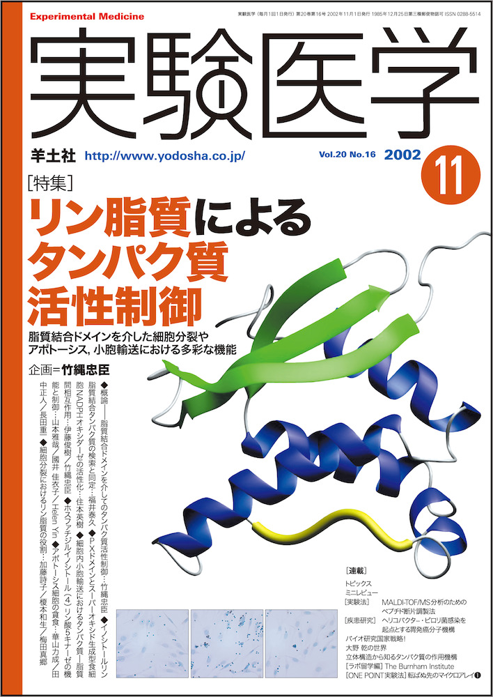 細胞内シグナル伝達系に重要な役割を果たしているリン脂質は、最近新たに発見されたPXドメイン、FYVEドメインなど、さまざまな脂質結合ドメインを介して、タンパク質の細胞膜や細胞内小器官へのターゲティングを行い、その活性を制御していることが明らかとなりました。そして多様な生理機能の調節因子としてダイナミックに機能していることが次々に明らかになり、現在大きな注目を集めています。そこで本特集では、細胞骨格の制御や膜輸送、細胞分裂やアポトーシス細胞の貪食の制御など、リン脂質の新たな機能について、最新の情報を交え詳しくご紹介します。