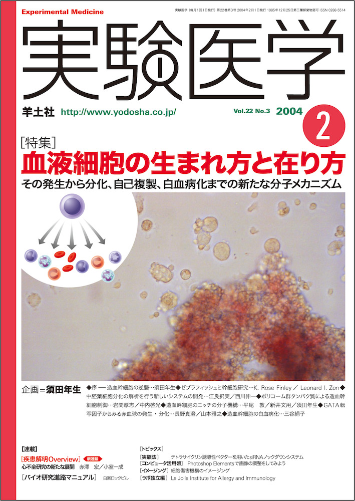 血液細胞は,一生にわたって新たな細胞が生み出されつづけることから,細胞の発生,分化や維持のメカニズム解明のための格好のモデルとして,最も研究が進んでいる細胞の1つです.最近,ホメオボックス遺伝子導入によるES細胞からの造血幹細胞誘導,自己複製に関与する転写制御因子やシグナル因子,微小環境をなすニッチ細胞の同定など,重要な発見が相次いで報告され,注目を集めています.本特集では,血液細胞の初期発生のメカニズムから,クロマチン修飾因子による自己複製能維持,ニッチの分子機構,赤血球分化に関わるGATA転写因子,さらに遺伝子異常による白血病化の機構まで,造血研究における最新の成果をご紹介します.
