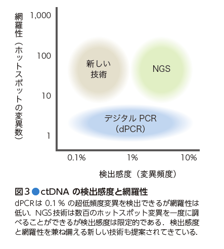 に集約されつつある.体内腫瘍量のモニタリングは,現在は血清腫瘍マーカーが最も簡便なツールとして用いられることが多い.実際,腫瘍マーカーは再発がある程度進んだ場合や時系列の変動が治療を反映している場合は有用な補助診断ツールである.一方で,感度・特異度の限界に加え,再発の確認にはCTスキャンなどの画像診断が必須であるため,さらなるマーカーが求められている.ctDNAによる変異検出を用いれば,特異性が高い結果が得られ,かつ早い時期に再発を発見できることが期待されている.肺がんなどで研究が進んでいる薬剤耐性遺伝子獲得については,特定の酵素に対する分子標的薬の耐性が耐性関連遺伝子変異と対応する性質を利用し,侵襲の大きい再生検の必要なしに治療戦略を構築できる.がん検診などで威力を発揮する可能性がある超早期がんの発見は,後述する技術開発と密接に関連しているが,採血のみで高精度のがん検診を提供できるようになる可能性がある.