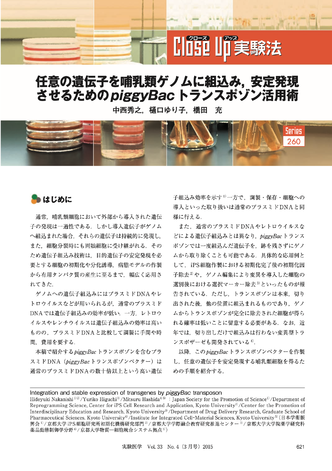 任意の遺伝子を哺乳類ゲノムに組込み,安定発現させるためのpiggyBacトランスポゾン活用術