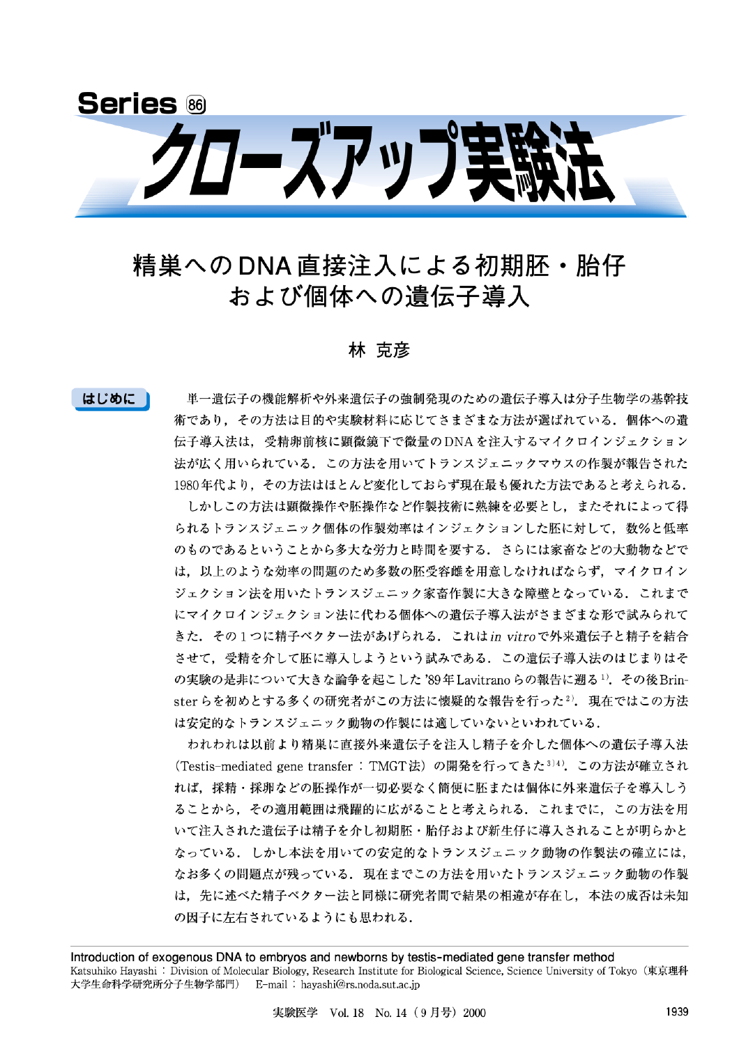 精巣へのDNA直接注入による初期胚・胎仔および個体への遺伝子導入