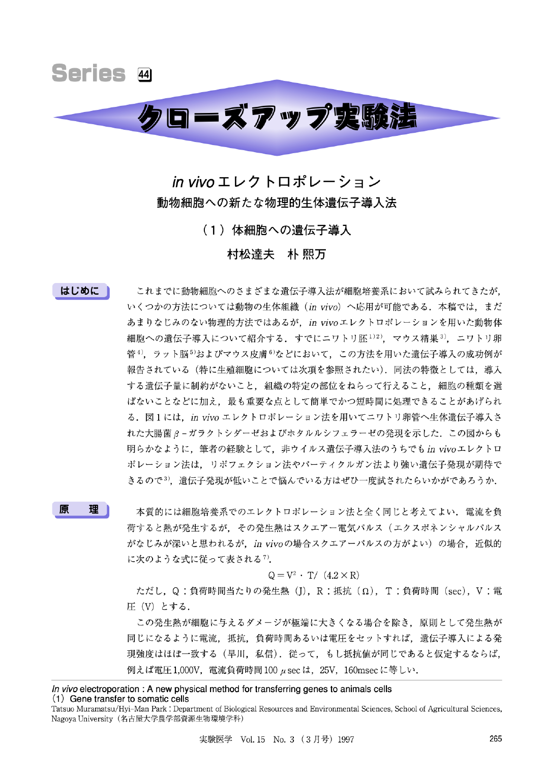 in vivoエレクトロポレーション 動物細胞への新たな物理的生体遺伝子導入法(1)体細胞への遺伝子導入/(2)マウス精子形成細胞への遺伝子導入