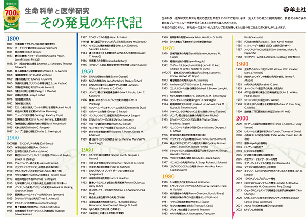生命科学と医学研究─その発見の年代記生命科学・医学研究の偉大な発見の歴史を年表スタイルでご紹介します.先人たちの努力と挑戦を礎に,読者のみなさまの新たなブレークスルーが書き加えられることを待ち望んでおります.本コンテンツは,研究の発展に合わせて項目を随時更新いたします.