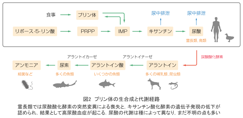 なお哺乳動物ではタンパク質の分解産物は尿素として排泄されるが,鳥類,爬虫類などではすべての含窒素代謝物が尿酸として総排泄腔から,ほぼ固形の形で排泄される.尿素であれば尿の形で膀胱に貯えねばならないので,空を飛ぶ鳥にとっては尿酸産生は有利な代謝系路であるといえる.鳥類の尿酸酸化酵素がどのような突然変異で活性を失ったかは,興味のある課題である.霊長類とは異なった,環境への適応の結果と考えられる.