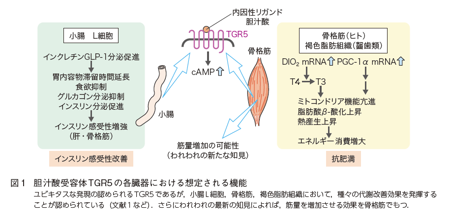 TGR5はユビキタスに発現の認められる受容体で種々の胆汁酸をリガンドとして認識し,細胞内cAMPを上昇させる.小腸下部,大腸においては胆汁酸によりTGR5が活性化されるとインクレチンGLP-1分泌が亢進する.摂食に伴い胆嚢が縮み,胆汁酸が小腸に分泌されると,GLP-1分泌が上昇し,血糖値の上昇に先がけて膵臓でのインスリン分泌を促すシグナルを伝達していると考えると,摂食応答因子である胆汁酸とTGR5機能の連携は理にかなっている.胆汁酸は小腸上部に分泌された後にその90%以上が小腸下部において特異的な輸送体により吸収され,肝臓へと戻る,いわゆる腸肝循環をくり返す.この際に,胆汁酸は全身血流(10 μM程度)にも流れ出し,マウスでは特に褐色脂肪組織,ヒトでは骨格筋においてTGR5を介してDIO2(typeⅡ iodothyronine deiodinase),PGC-1α遺伝子発現を上昇させ,熱産生亢進を介して抗肥満効果を発揮することが明らかにされている(図1)1).