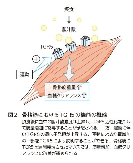 われわれは骨格筋におけるTGR5の機能に興味をもち,ヒトTGR5を骨格筋に過剰発現させた遺伝子改変マウスを開発した.オバキュノン投与実験結果と同じく,後肢骨格筋の重量増加が観察された(論文投稿中).骨格筋には複数のGタンパク質共役受容体が発現しており,例えばβ2アドレナリン受容体のアゴニスト処理により細胞内cAMPが上昇し,筋量増加することが認められている4).これらの知見とマウス表現型は一致する結果と言える.同時にこのマウスを用いて経口糖負荷試験を行うと,血糖値のすみやかなクリアランスが認められ,耐糖能異常の改善が認められる.さらに興味深いことに,骨格筋でのTGR5発現はトレッドミル走行運動により上昇する.