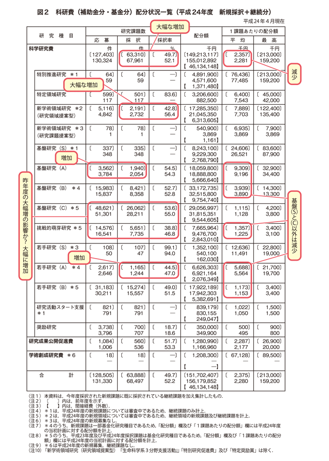 個々の種目別にみていくと,基盤研究(S)のみが増額されただけで,基盤研究(A), (B), (C),若手研究(A), (B),挑戦的萌芽研究などが軒並み配分額が減少した.特に基盤研究(B)で25.7万円減少と中堅の研究者にとって厳しい内容だった.また若手研究(A)ではさらに減少幅が大きく,28万円の減額だった.