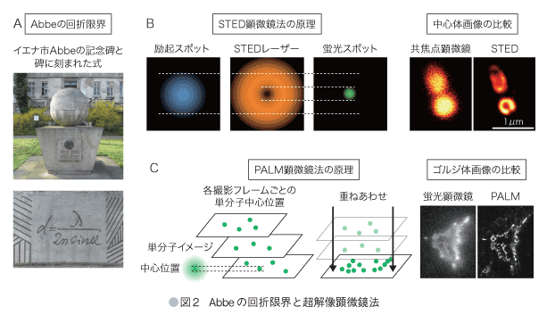 「光学顕微鏡では光の半波長よりも高い分解能を得ることはできない(回折限界)」.近代顕微鏡の父Ernst Abbeによる,記念碑にも刻まれている光学顕微鏡の空間分解能を示す式である(1873年,図2A).可視光の場合,高々200 nm程度.100年以上のあいだ超えることは不可能だと信じられてきたこの壁を打ち破る“超解像蛍光顕微鏡法”の開発に対し,今年のノーベル化学賞が