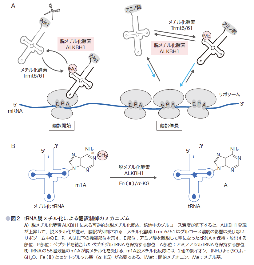 tRNAは,翻訳過程で中心的分子であり高度にメチル化されている.今回,脱メチル化酵素(ALKBH1:alkylation damage repair B homolog-1)がtRNAの翻訳機能を制御することが示された(Liu F, et al:Cell, 167:1-13, 2016,図2A).これは,tRNAの可逆的なメチル化が転写後で遺伝子発現を制御する画期的な成果である.
