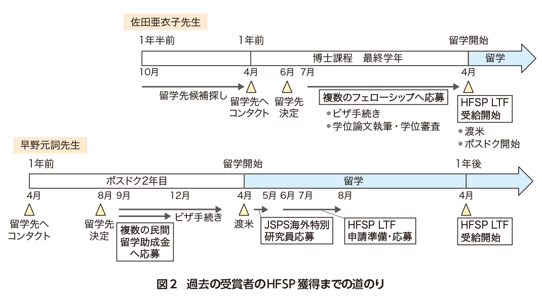 でも,いつから,どうやって準備をはじめればいいのだろうか.応募にはさまざまな準備が必要だ.留学先候補探し,プロジェクトの話し合い,申請書の作成と推敲,推薦書の依頼,面接,英語でのやりとり,時差.しかし,恐れることはない.しっかり準備して臨めば,十分にフェローシップ獲得の可能性はある.ここでは一例として実際に過去のHFSP(ヒューマン・フロンティア・サイエンス・プログラム)フェローシップ受賞者らがどのように準備したか見てみよう(図2).佐田亜衣子先生(留学先:コーネル大学)は,留学する1年半程前から候補を探し,返信がこないことも見越して早めに連絡をとりはじめている.しかし,留学先決定後に応募準備をはじめたため,いくつかのフェローシップは締め切りに間にあわなかったと振り返る.早野元詞先生(留学先:ハーバード大学)は,さらに早くから準備しHFSPに加えJSPS(日本学術振興会),民間助成金等複数のフェローシップへ応募.英語書類の添削にも時間を要するため,ネイティブの友人にも協力を頼んだそうだ.それでも3人のPIへの推薦書依頼がギリギリになってしまったとのこと.また,HFSPは最大2年の中断が可能で,その期間別の資金が獲得できる上,3年目は帰国後も使用可.うまく制度を組合わせることで,留学前〜帰国後まで長期支援の可能性がある.JSPSとHFSP両者を受給した山形一行先生(ボストン小児病院)は,まず事務局へ相談することの重要性を強調していた.