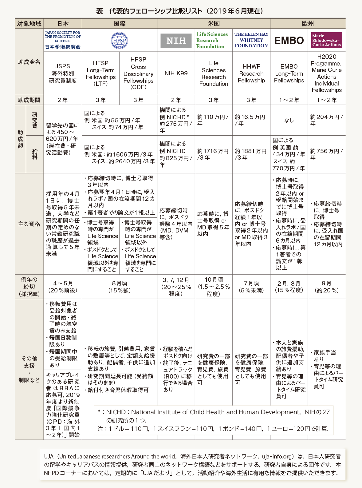 このように,留学を考えるとまず留学先候補探しに専念しがちだが,自分が留学したい国で,自分が応募できるフェローシップ情報を同時期に調べはじめるのが重要だ.しかし下調べは想像以上に大変で,詳細に気を留めていなかったばかりに,獲得後,思いがけない制限に苦労することもよくあるようだ.あらかじめ各フェローシップのメリット,デメリットを把握しておくことは必須と言える(表).国際的にも評価の高いHFSPは,生活費だけでなく研究費・移転費がつく上,子ども一人ごとの育児手当,給付産休制度等,独自のメリットが多数みられる一方で,PhD取得後3年以内,かつ専門分野を変える必要性があるなど,応募資格には留意が必要となる.その他のフェローシップについては,表とWebサイトを確認のこと.特に,応募資格,帰国制限に注意してほしい.多くの先輩方が涙を飲んできた.