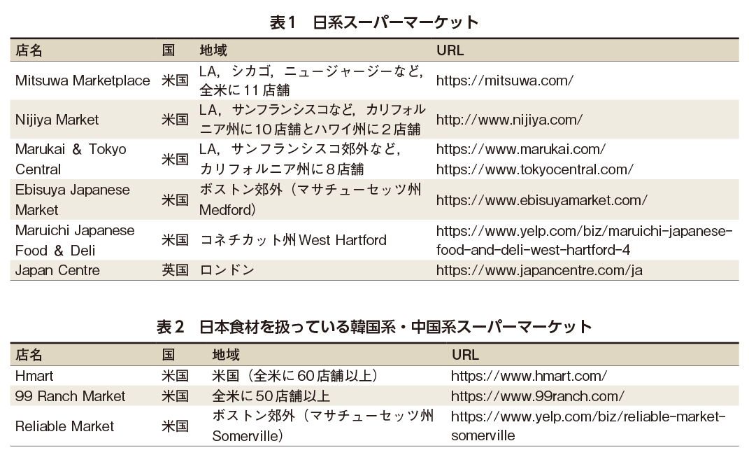 最近では,海外でも日本食材を購入できる店や日本食を食べられる場所が増えてきている.ロサンゼルスやサンフランシスコ,ロンドンなど日系企業が多く集まる都市には日本人街があり,日系のスーパーマーケットや日本食のレストランが充実している.研究者が多く集まるニューヨークやボストンでは,日本人街はないものの,日本人が多く留学していることから中国系・韓国系のスーパーマーケットで日本の食材や調味料を多数取り扱っている.基本的に日本での価格よりも2〜4倍ほど高いものの,多くの日本の食材(調味料,レトルト食品,菓子類,乾燥食品,飲みものなど)が購入できる.