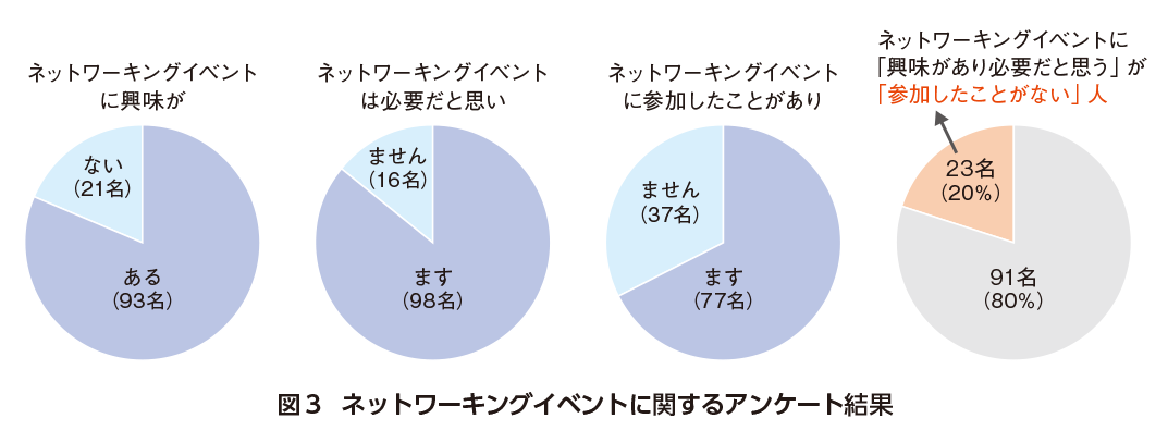 UJAが実施したアンケート〔回答者数114名(2020年4月実施)〕によると,「理想のネットワーキングイベント」の形態として,①異分野の研究者が,講演とディスカッションを通して影響を与え合い学び合うことができる「講演会型」のイベントと,②異分野・異業種の学生・研究者・専門家が,年齢と立場の垣根を越え,家族ぐるみで飲食しながら気軽に楽しく有益な情報を交換し,人脈をつくることができる「パーティー型」のイベントがあげられた.「日本に足りないイベント」としては,異分野・異業種の人たちが,年齢と立場の垣根を越えて気軽に議論し,コラボレーションやイノベーションを生み出すイベントとの回答だった.回答者の多くがネットワーキングイベントに「興味がある」〔93名(82%)〕,「必要だと思う」〔98名(86%)〕と答えたにもかかわらず,「興味があり必要だと思う」が「参加したことがない」と答えた人が〔23名(20%)〕いた(図3).この数字の乖離には,回答者本人の意欲に帰する原因と,理想的なイベントが不足している実情とがあるだろう.参加者側としては,これと思ったイベントに飛び込んで開催者とともに盛り上げていく心がけが必要だ.理想的なイベントを増やすためには,social capitalを高めるネットワーキングのメリットの社会的認識を高め,研究者に時間を与え,若手研究者が中心となり自由に企画運営し,理想のネットワーキングイベントを開催できるような環境づくりが必要と考える.